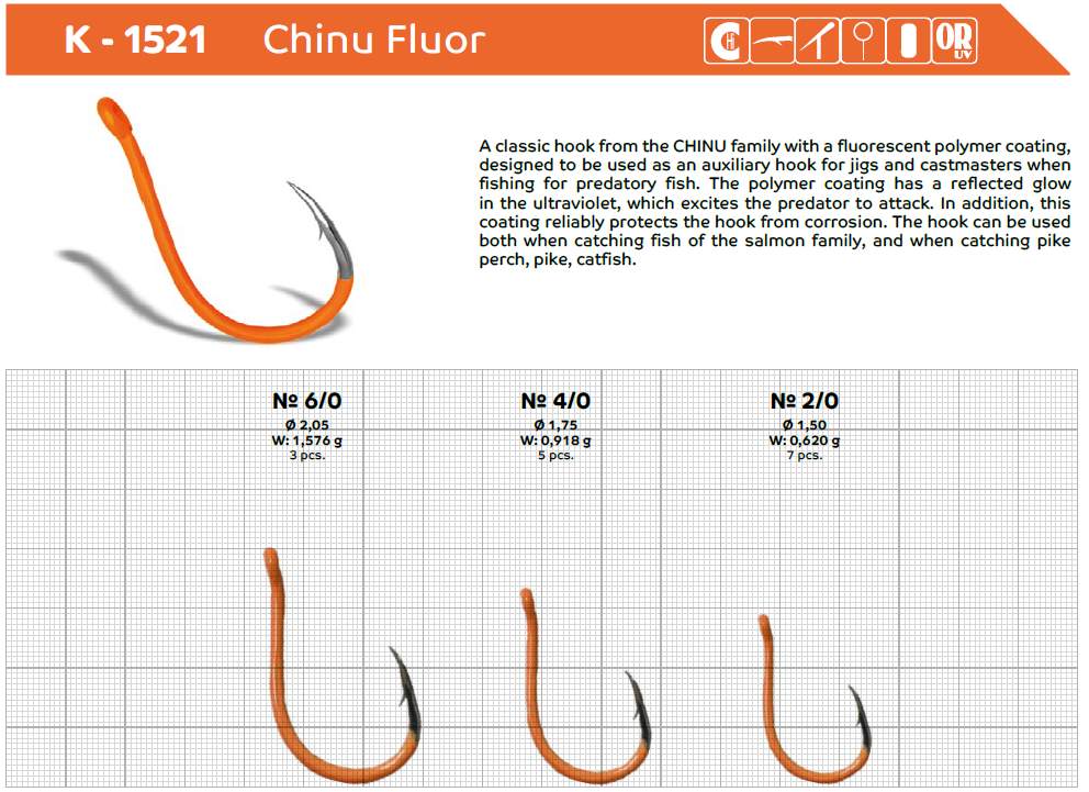 Klasický háček z rodiny CHINU s fluorescenčním polymerovým povlakem, navržený pro na lov dravých ryb.